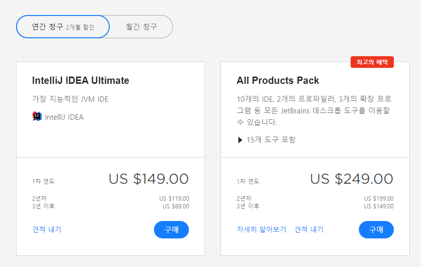 기능이 제한된 무료 버전(커뮤니티 버전)이 있지만, 유료인 Ultimate 버전을 사용해야 인텔리제이의 장점을 살릴 수 있다