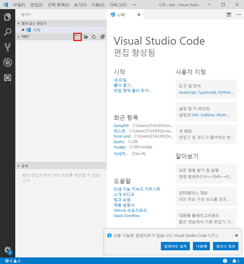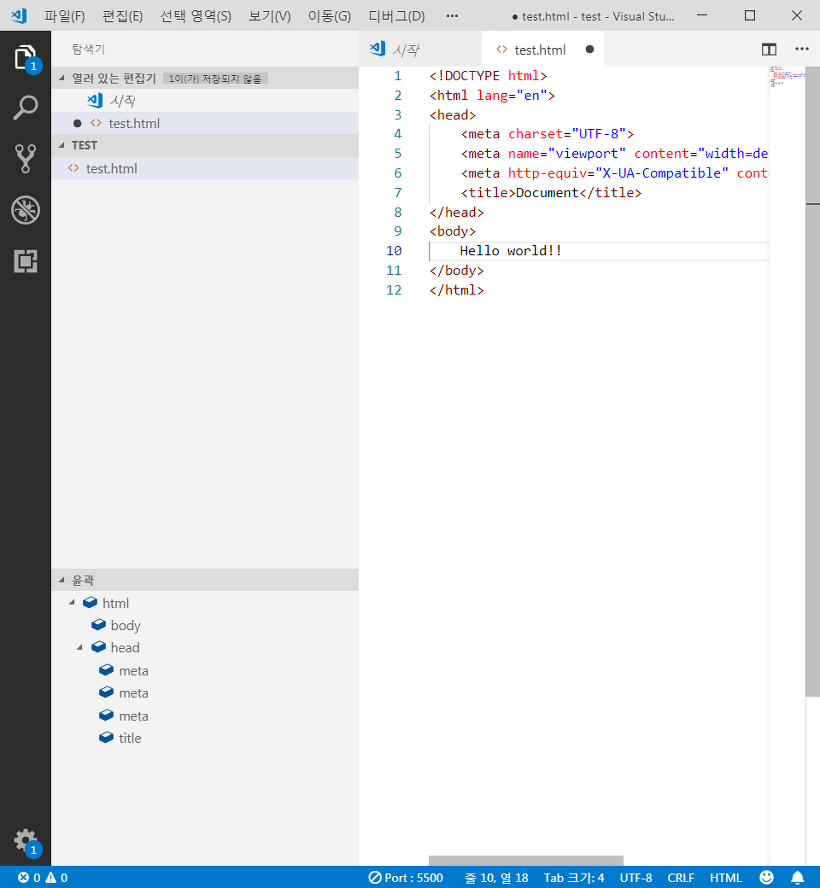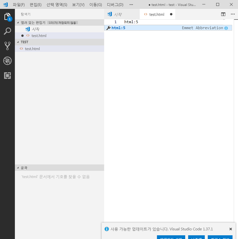 - 새파일 아이콘을 클릭 후 파일명에 test.html을 입력하여 html 파일을 생성한다.