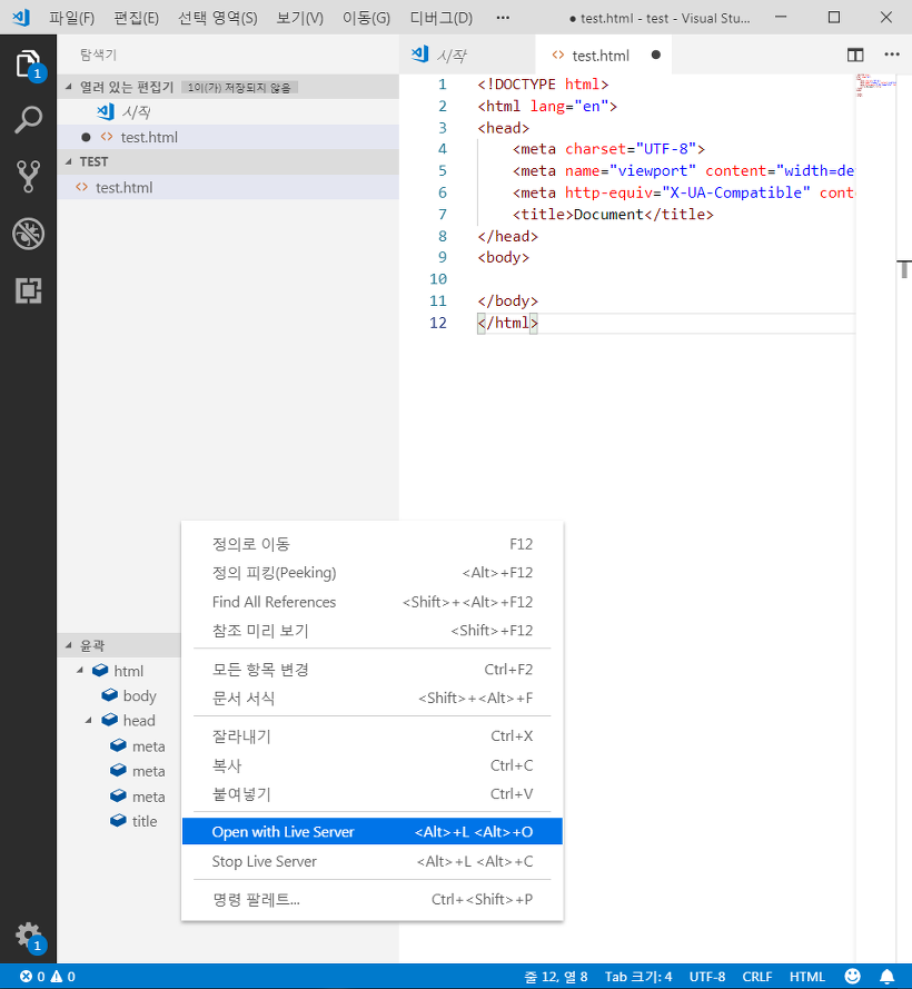 - 좌측 코드 탭을 우클릭한 후 Open with Live Server 메뉴를 클릭한다.