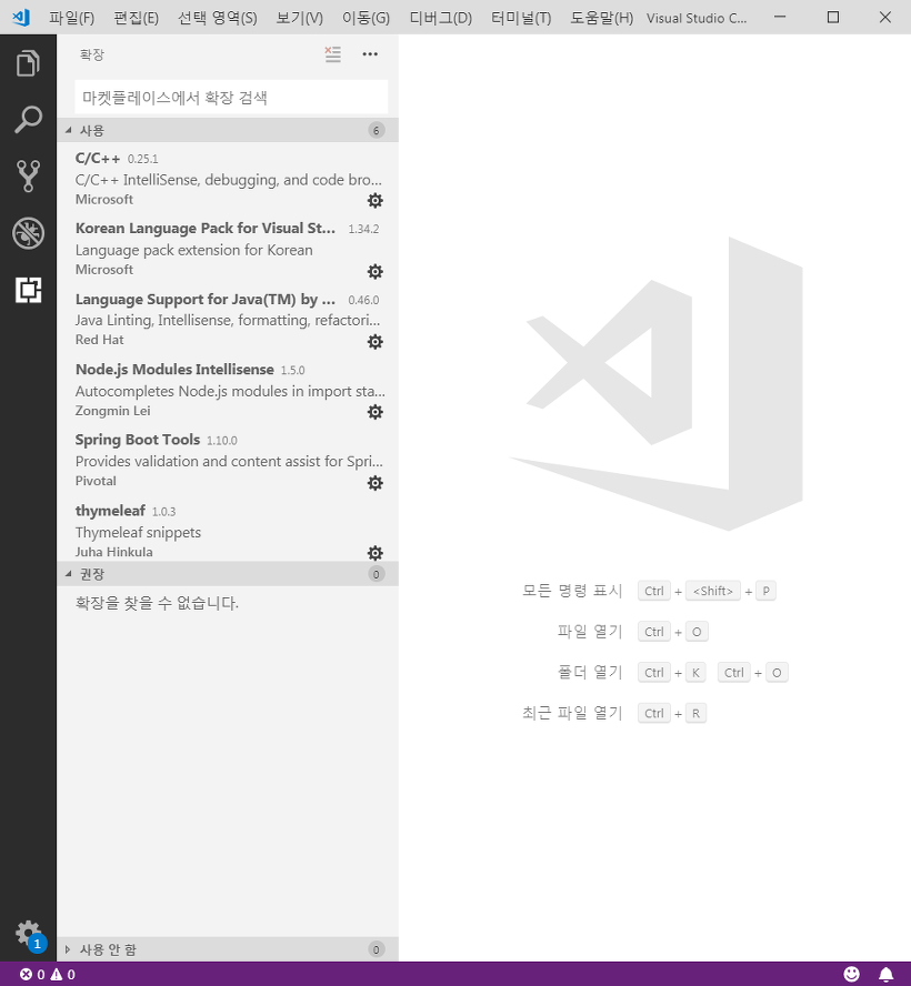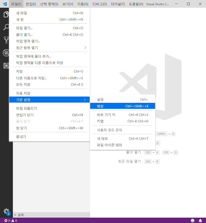 - VS Code 실행 후 파일 > 기본설정 > 확장 메뉴를 클릭한다.