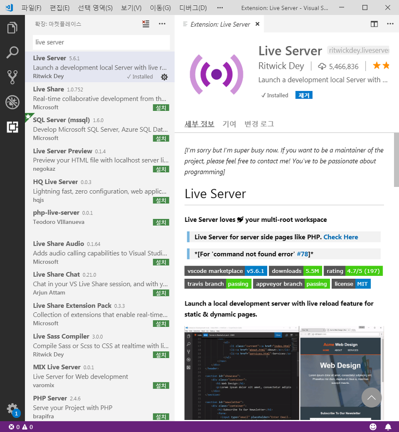 - 검색창에서 live server를 검색 후 설치버튼을 클릭한다.