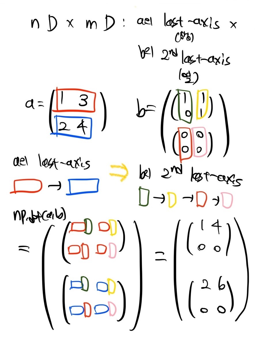 왼쪽 array의 last axis, 오른쪽 array의 second last axis 끼리 곱한다고 되어있지만,